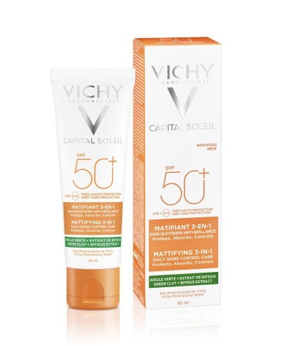 Ежедневный уход для жирной проблемной кожи с комплексом солнцезащитных фильтров широкого спектра действия надежно защищает от UVB-, UVA- и длинных UVA-лучей. Формула с технологией контроля жирного блеска и зеленой глиной в составе мгновенно абсорбирует избыток кожного себума, сокращая вероятность возникновения несовершенств. Пробиотик BIFIDUS в составе формулы поддерживает целостность кожного барьера, витамин Е натурального происхождения защищает от оксидативного стресса, а Вулканическая термальная вода VICHY, обладающая восстанавливающими и укрепляющими свойствами, усиливает защитный барьер кожи.