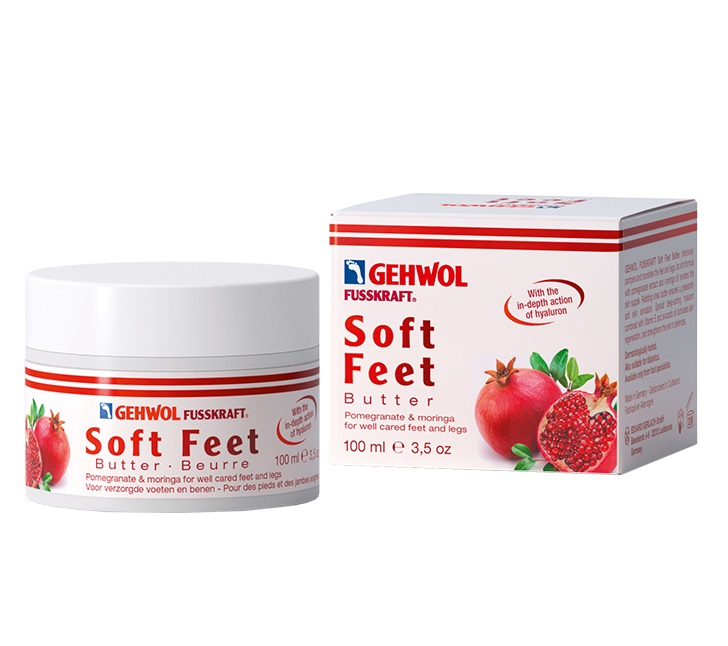 Крем-баттер Gehwol Fusskraft Soft Feet Butter интенсивно питает кожу ног и стоп. Его богатая формула с экстрактом граната и маслом моринги делает кожу упругой. Насыщенный крем с маслом ши придает коже приятное ощущение мягкости, усиливает ее липидный барьер. Специальная гиалуроновая кислота, которая удерживает влагу в глубоких слоях кожи, в сочетании с витамином Е и маслом авокадо активизирует регенерацию кожи и укрепляет ее защитные функции.